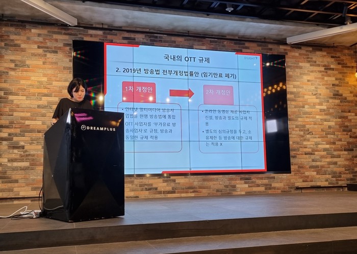 첫 번째 강연자로 나선 표경민 변호사는 ‘OTT에 대한 해외 & 국내 규제’라는 주제로 강연하며, “OTT 규제는 방송과의 구조적 차이를 고려하여, 방송과 상이한 새로운 규제체계를 적용하는 수직적 규제와 방송의 대체산업이라는 관점에서 방송과 동일한 수준의 규제를 적용하는 수평적 규제에 대해 논의를 전개해 왔다”고 말했다.