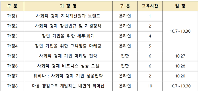 교육구성은 다음과 같다. 사회적 경제 기업을 창업·경영하는데 필수적인 ▲ 사회적 경제 창업법규 및 지원정책 ▲창업 기업을 위한 세무·회계 ▲ 창업기업을 위한 고객창출 마케팅 등 온라인 연수 4개 과정, ▲사회적 경제 기업 성공 전략 웨비나 1회, 사회적 경제 기업 마케팅 전략 등 오프라인 연수 2회 등이다.