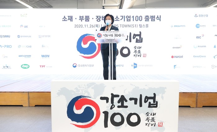 [더스타트 = 윤상학 기자] 중소벤처기업부는 서울 강남구 팁스타운 팁스홀에서 지난 27일, 「소재・부품・장비 강소기업 100 」 대표와 유관기관이 함께 ‘강소기업 100 출범식’을 가졌다고 밝혔다.