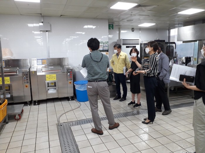 | ▲ 심사위원단이 광주시 동구를 방문해 다량사업장(광주은행 본사) 감량기 부산물(사업장폐기물로 처리중) 시설을 둘러 보고 있다. |