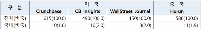투자유치를 통해 기업가치가 1조원이 초과해도 ➀‘씨비-인사이트(CB-Insights)’에 등재되지 않아 누락되거나, 마지막 투자시점 기준으로 기업 가치를 산정하기 때문에, ➁기업가치 변동을 반영하지 못하는 경우, ➂기업이 등재를 희망하지 않는 경우 등으로 유니콘 기업 현황 파악이 어렵고, ④등재 이후 상장(IPO)이나 기업 인수합병(M&A) 등의 이유로 제외된 경우도 파악 할 수 있어야 한다는 등 다양한 지적들이 있었다.