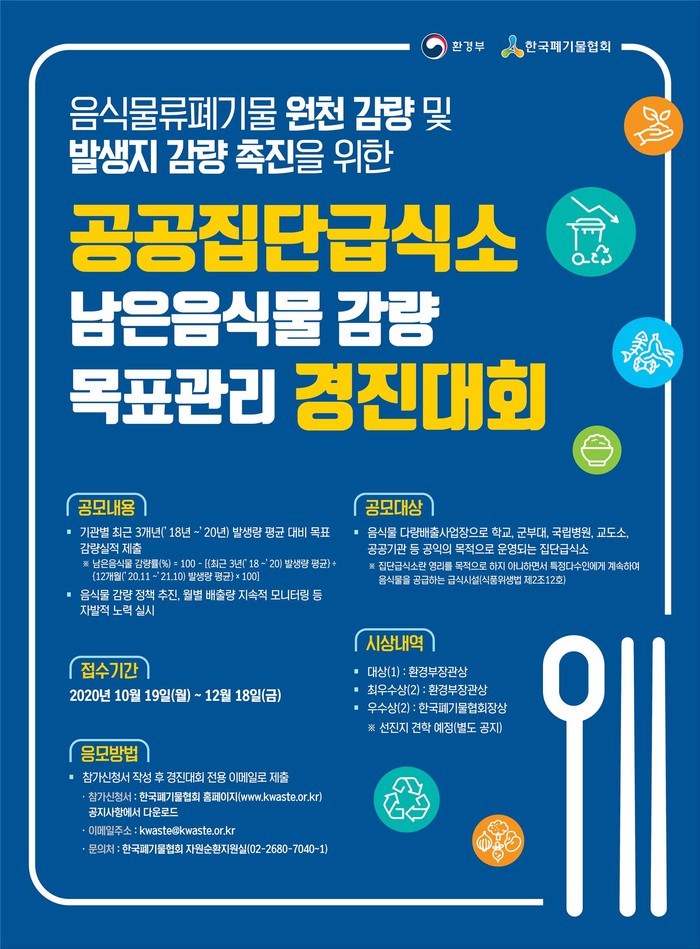 올해 처음 평가 진행된 ‘남은음식물 목표관리 및 감량경진대회’는 남은음식물 발생량의 지속적 증가로 인한 경제적 손실, 처리시설 부족, 민원 발생 등 고질적 문제 발생으로 발생지 감량의 필요성이 대두되면서, 공공집단급식소의 음식물류폐기물 감량 활동을 유도하고 우수사업장을 발굴해 평가·포상하기 위해 실행됐다.
