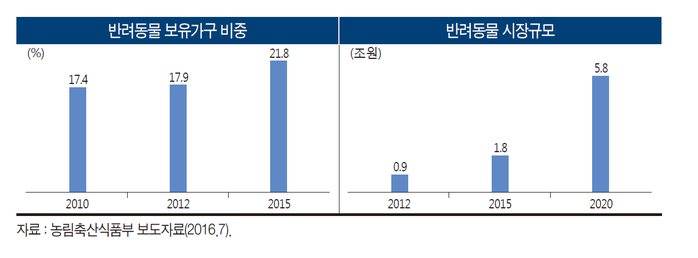 | ▲ 해 마다 증가하는 반려동물 보유가구와 시장규모 (사진출처=농림축산식품부 보도자료) |