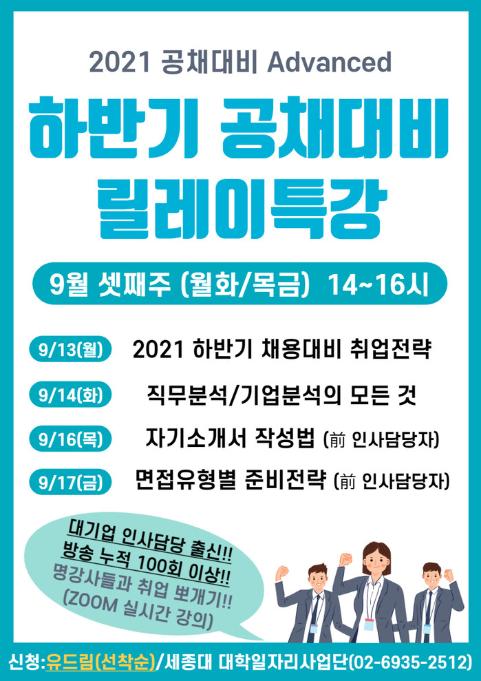 신청은 경력개발시스템(유드림)을 통해 할 수 있으며, 취업에 관심 있는 세종대 재학생이라면 누구나 신청 가능하며, 자세한 내용은 세종대 대학일자리사업단에 문의하면 된다.