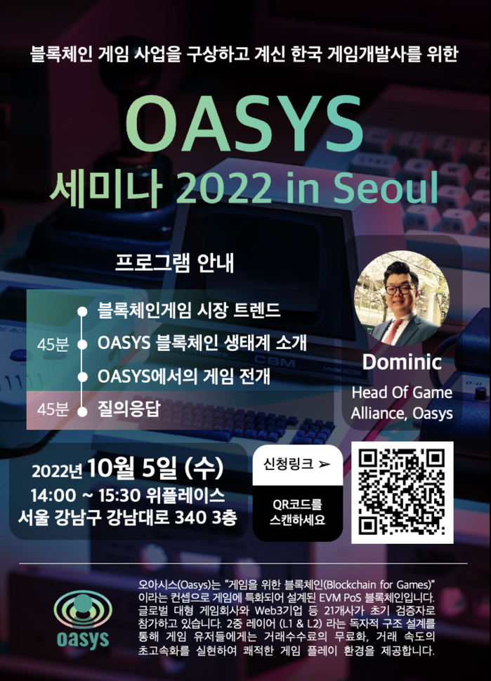 이번 강연 및 진행은 오아시스에서 Head of Game Alliance를 맡은 도미닉 장(Dominic Jang)이 블록체인게임 시장에 대한 트렌드와 더불어 오아시스 블록체인 생태계 소개, 오아시스에서의 게임전개 등에 대하여 소개할 예정이다.