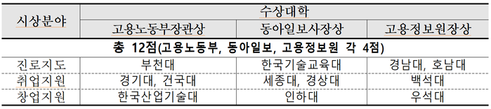 | ▲ 각 수상 영역별 지정대학과 파트를 구분해 발표했다. 9사진출처=고용노동부) |