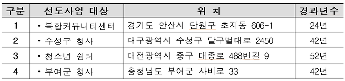 | ▲ '노후 공공 건축물 리뉴얼 사업' 으로 지정된 4곳의 위치와 경과년수이다. (사진출처=국토부) |