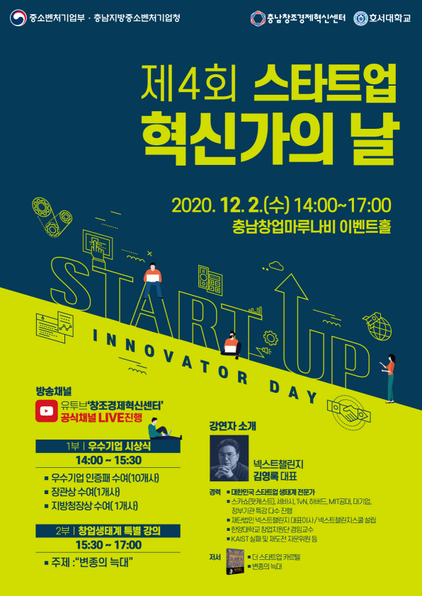 | ▲ '스타트업 창업 혁신가의 날' 에서 창업 생태계 전문가들을 초빙한 강의이다. (사진출처=충남도) |
