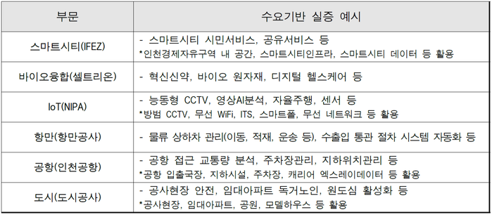 | ▲ '실증자원 및 혁신기술 제안' 의 6대 분야의 세부내용이다. (사진출처=인천경제자유구역청) |