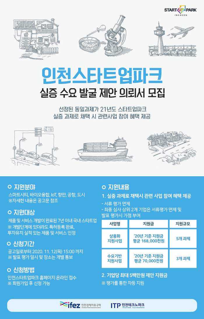 스마트시티(IFEZ), 바이오융합(셀트리온), IoT(NIPA), 항만(인천항만공사), 공항(인천국제공항공사) 및 도시(인천도시공사) 등 총 6개 분야 가운데 하나를 선택해 ‘제안의뢰서’를 제출하면 각 분야 당 5개 이내로 총 30개 이내의 기업이 선정된다.