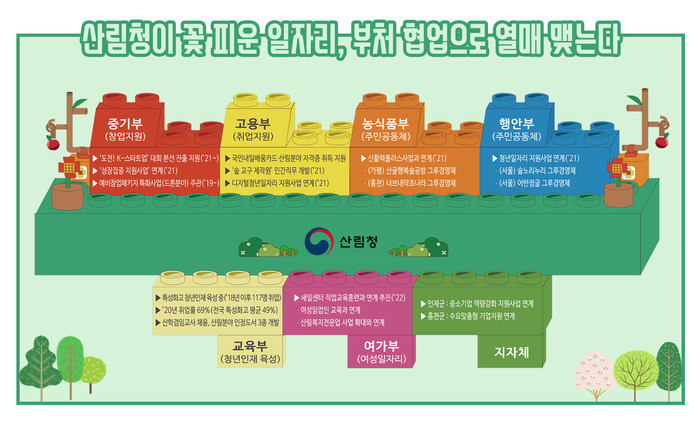 한편, 농식품부 주관 ‘신활력플러스사업’과 행정안전부 주관 ‘지역주도형 청년일자리 지원사업’ 등에는 산림청 산림일자리발전소 발굴 그루경영체(주민공동체) 등이 참여하여 사업 고도화를 위한 협업을 진행하고 있다.