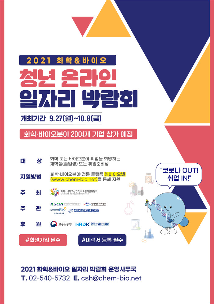 켐바이오넷을 운영하는 화학.바이오산업 인적자원개발위원회 신흥순 사무총장은 온라인으로 개최되는 이번 일자리 박람회가 코로나로 인해 취업이 어려워진 청년들에게 도움이 될 수 있는 계기가 될 것으로 기대한다고 밝혔다.
