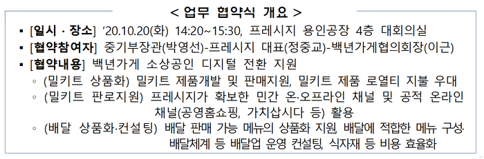 이번에 체결된 협약은, 작년 5월부터 중소벤처기업부가 ‘상생과 공존의 가치 실현’을 위해 추진하고 있는 ‘자상한 기업’ 시리즈 중 19번째로 ‘백년가게’ 같은 전통 소상공인들이 코로나19 이후의 디지털 전환에 성공적으로 적응할 수 있도록 적극 지원하겠다는 의지에 따라 성사됐다.