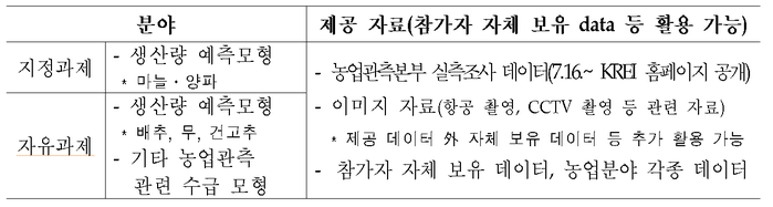 | ▲ 2개 부문으로 구성하고 있는 '제 1회 농산물 수급 예측모형 경진대회' 의 분야안건이다. (사진출처=농식품부) |
