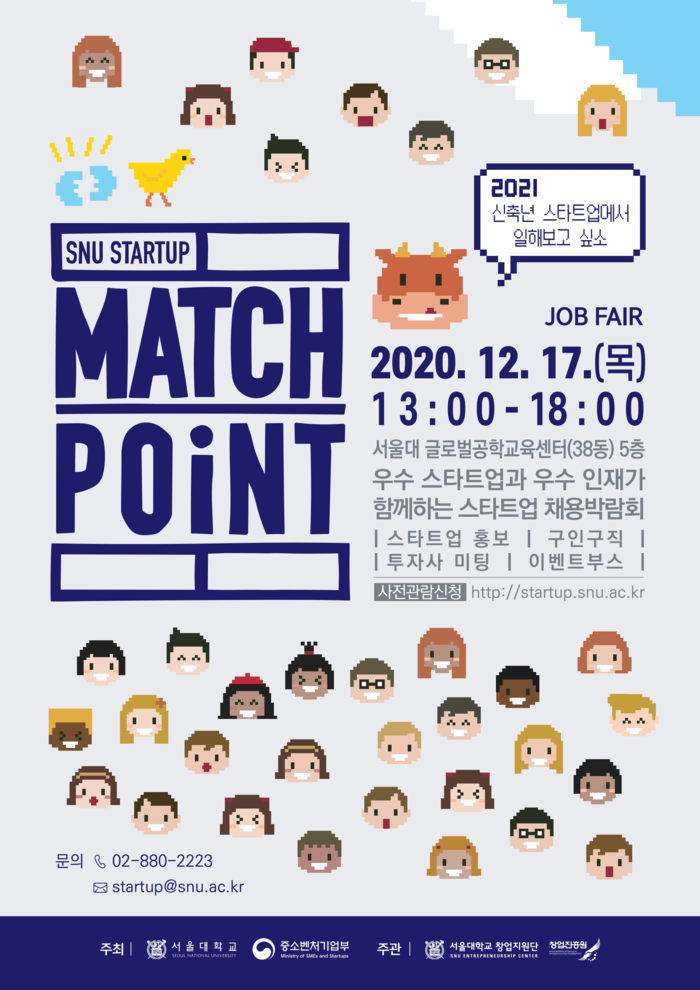 서울대학교와 중소벤처기업부가 공동으로 주최하는 이번 행사는, 유망 스타트업 28곳이 참가하며 인재 매칭과 인재 면접 그리고 스타트업 투자사 간 매칭 프로그램 등이 예정되어 있다.