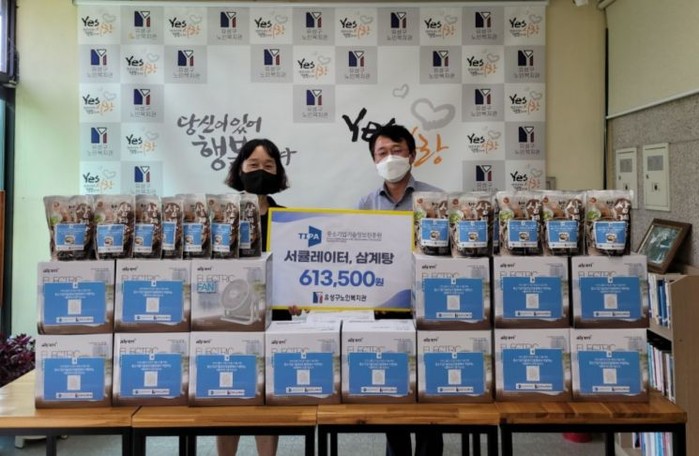 TIPA는 공공기관으로서 사회적 책임을 이행하기 위해 오랫동안 교류 해왔던 동 노인복지관과 협력해 에너지 취약계층 30개 가정에 서큘레 이터와 오는 10일 말복을 맞아 즉석조리가 가능한 삼계탕을 전달했다.
