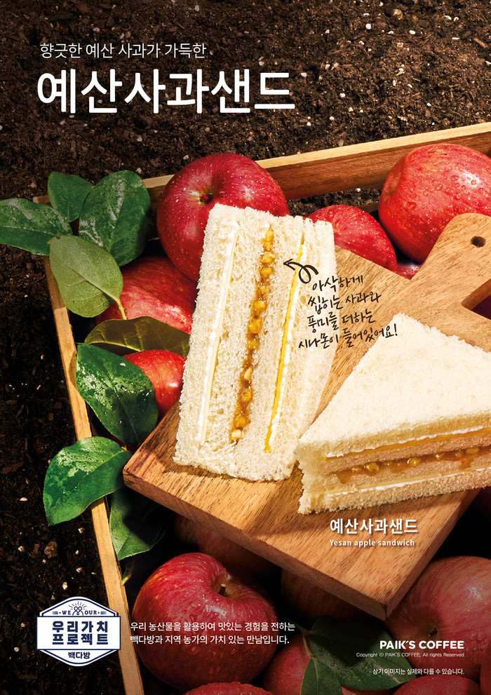 ‘예산사과샌드’는 부드러운 식빵 사이에 향긋한 예산 사과로 만든 예산사과잼과 수제크림을 더해 달콤한 풍미가 일품이다. 특히 예산사과잼은 일반 잼 대비 사과를 크게 썰어넣어 씹는 식감이 좋아 부드러운 샌드위치의 매력을 한 층 높여준다.