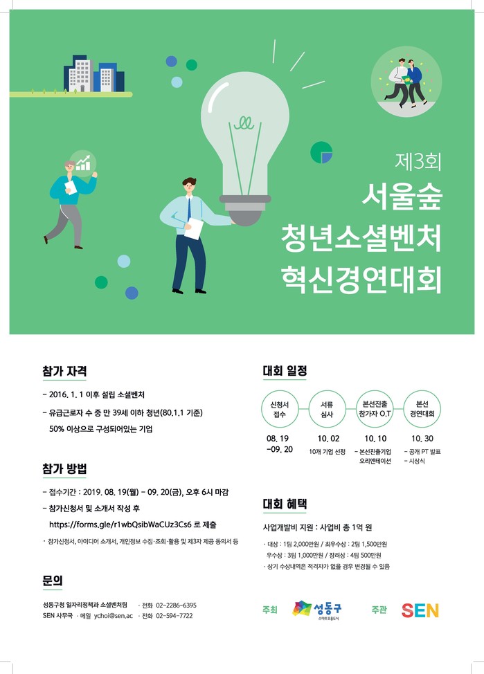 신청자격은 2016년 1월 1일 이후 설립한 소셜벤처 기업으로 유급근로자 수 중 청년의 비율이 50% 이상이면 지원가능하다. 참가신청서, 제출서류 및 접수방법 등 자세한 사항은 성동구청홈페이지 공고문에서 확인할 수 있다.