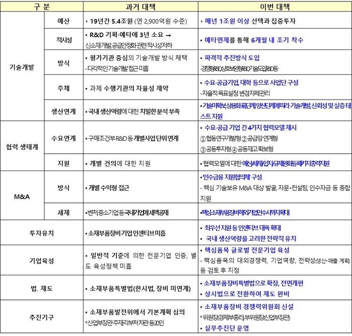 이번 대책은 기업 간 협력모델 구축, 개발이 양산으로 이어지는 사다리 정책 추진, 적시성 있는 집중투자와 기술획득 방법 다각화, 조속한 생산.시설 투자가 가능한 패키지 지원에 중점을 뒀다.