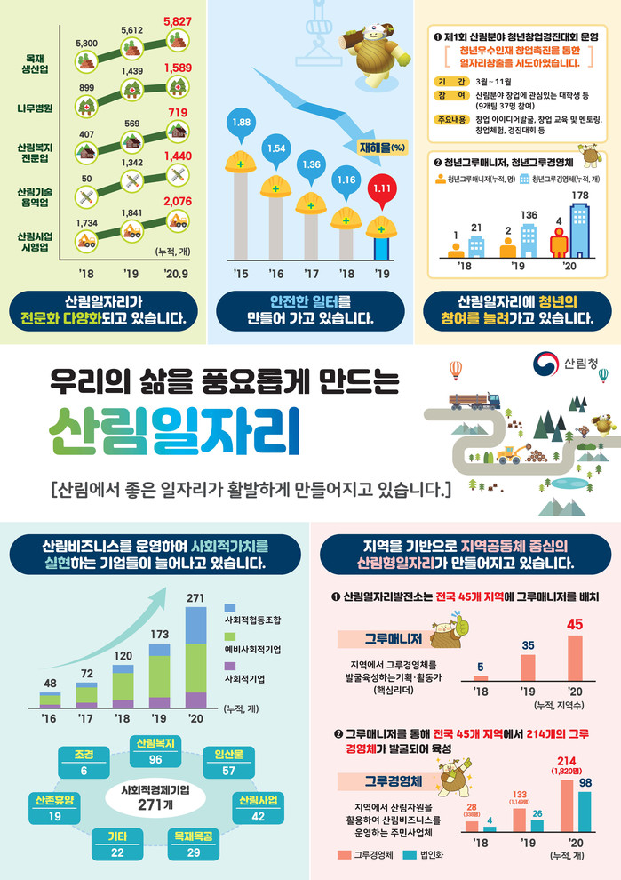 더불어, 안전한 일터를 만들기 위해 다양한 노력을 기울이고 있다. 산림 분야 근로자들에 안전교육 실시 및 안전수칙 준수 등을 강화하고 있으며, 특히 올해에는 안전한 산림일자리를 위한 ‘안전관리 지침서’를 제작⋅배포하였고, 이와 함께 ‘찾아가는 안전사고 예방 교육’을 체계적으로 실시하여 산림사업 재해율도 점차 감소추세에 있다.