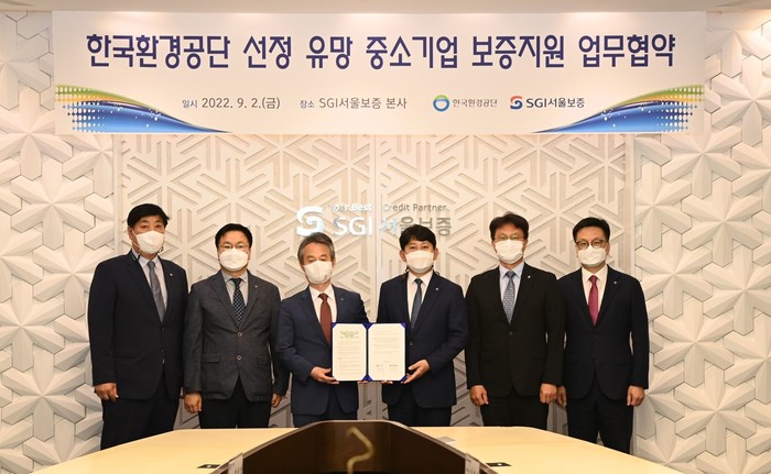 | ▲ 한국환경공단 안병옥 이사장(왼쪽에서 세 번째)과 SGI서울보증 대표이사 유광열 (왼쪽에서 네 번째)이 기념촬영을 하고 있다<사진제공=한국환경공단>. |
