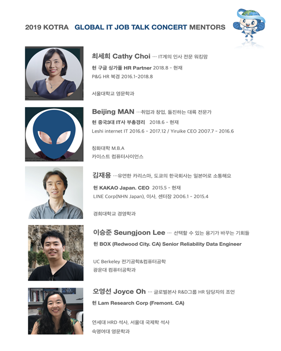 지난해 코트라는 미국 실리콘밸리에서 취·창업에 성공한 한국인을 초청한 가운데 이번 행사에서는 4개국으로 확대, 실리콘밸리뿐만 아니라, 북경, 베이징, 싱가포르에 취업한 5명을 초청, 해외 취업의 궁금증을 풀어보는 시간이 됐다.