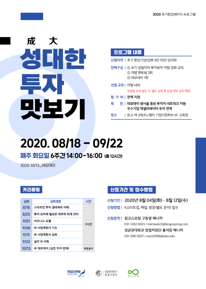 [더스타트 = 윤상학 기자] 스타트업 컨설턴트 “킹고스프링(Kingostring)”이 성균관대학교 창업지원단과 협력하여 ‘성대(成大)한 투자 맛보기’ 프로그램을 다가오는 8월 18일부터 22일까지 약 6주간 판교 제 2테크노밸리 기업지원허브 6층 교육장에서 개최한다.
