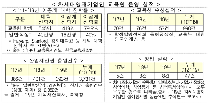 지난 11년 간 특허청에서 주관하고, 한국발명진흥회 그리고 KAIST·POSTECH 등에서 추진한 ‘차세대 영재기업인 육성사업’을 통해 교육을 수료한 학생들은 ▲지식재산권 출원 3,731건, ▲스타트업 창업 47건, ▲대한민국 인재상 37명 수상 등의 실적을 기록하며 사회에서 ‘지식재산 CEO’ 로 활동하는 등의 성과를 달성했다.