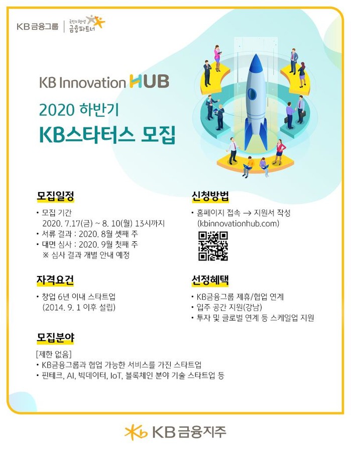 2014년 9월 1일 이후 설립된 업체라면 사업분야에 제한 없이 지원할 수 있으며, 내달 10일까지 KB이노베이션허브 홈페이지를 통해 온라인으로 신청할 수 있다.