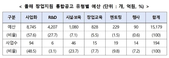 지원유형별 창업지원 현황을 보면 창업사업화(8,745억원, 57.6%), 기술개발(R&D)(4,207억원, 27.7%), 시설‧보육(1,080억원, 7.1%), 창업교육(828억원, 5.5%) 순으로 나타났다.