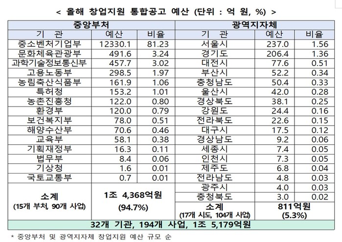 기관별 창업지원 현황을 보면 사업 분석 결과, 중앙부처는 15개 부처에서 90개 사업(46.4%)에 1조 4,368억원(94.7%)을 지원하며, 스타트업 육성 전담부처인 중기부가 40개 사업, 1조 2,330억원(81.2%)으로 가장 높은 비중을 차지했다.