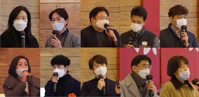 | ▲ 기업의 대표자들이 성과 발표를 하고 있다.(왼쪽 상단부터 시계방향으로)임팩토리얼 이지은 대표, 주차장 만드는 사람들 김성환 대표, 밸리스 신재연 소장, 에코라이프패키징 황금찬 공동대표, 그린베어 남궁승우 대표, 요크 장성은 대표, 엔케이이노베이션 김종배 대표, 플린트랩 윤혁진 대표, 트래쉬버스터즈 곽재원 대표, 레미디 김민희 대표 |