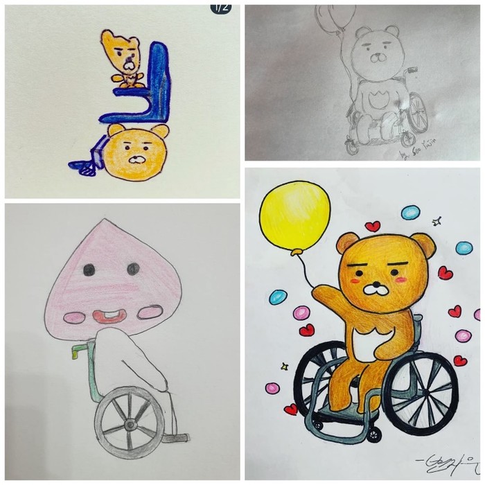 | ▲ 휠체어 탄 라이언챌린지 참여 손그림들(왼쪽위 서지현검사 오른쪽위 자폐작가 이지현씨 왼쪽아래 쵸키박 작가 오른쪽아래 이정헌작가) |