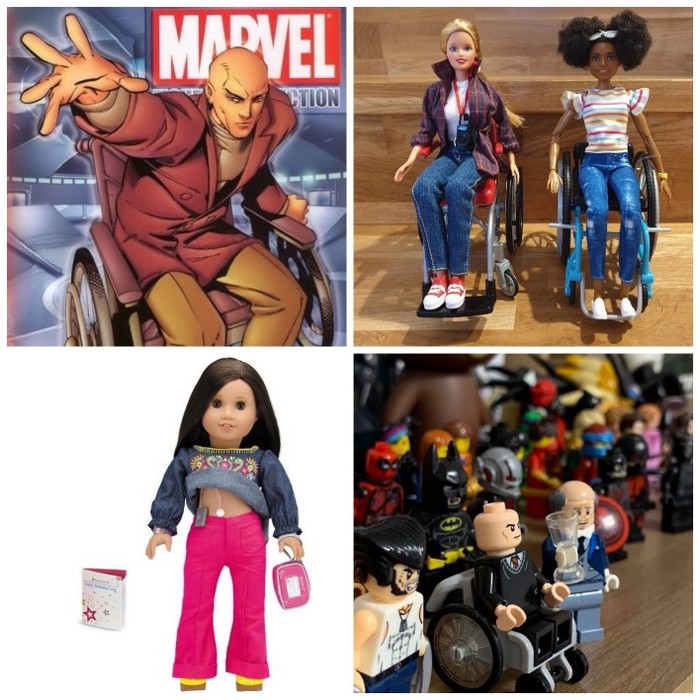 | ▲ 외국의 장애 반영 캐릭터나 완구. 왼쪽 위부터 시계방향으로 마블 프로페서X, 휠체어 탄 바비인형, 휠체어 탄 레고, 당뇨측정기를 부착한 인형 |