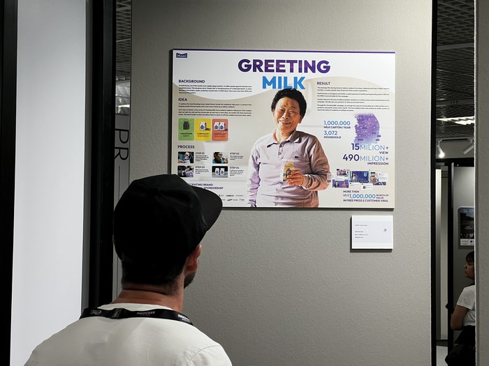 | ▲ 칸 라이언즈 2022 현장에서 매일유업 우유안부(Greeting Milk) 캠페인 보드를 확인하고 있는 외국 참관인의 모습 |