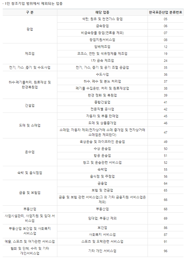 지원내용은 사무공간, 현장 및 회의실, 상담실, 휴게실 등을 제공하고 있고 세무, 회계, 법률, 마케팅 등의 경원지원교육과 자문을 무상으로 실시하고 있다. 또한, 1인 창조기업과 외부기관 간의 프로젝트 연계 및 수행 기회를 제공하여 지식서비스 거래 및 사업 활성화를 제고하고 있다. 하지만, ‘1인 창조기업’ 이라고 해도 창업 업종에 따라 지원대상직종이 아닌 경우가 있다. 다음은 1인 창조기업 범위에서 제외되는 업종이다.