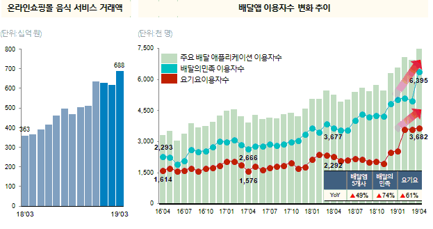 | ▲ 배달음식 가격추이 변동과 배달앱 사용 횟수 상승폭이다. (사진출처=통계청, 요기요) |