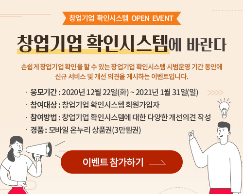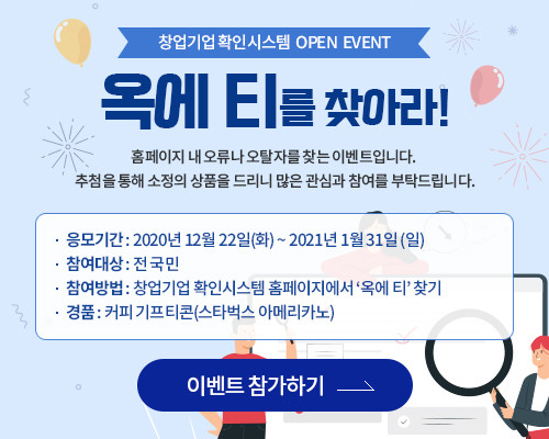 한편, 중소벤처기업부는 시범운영 기간(’20.12.22~’21.1.31)에 ▲‘옥에 티를 찾아라’, ▲‘창업기업 확인 시스템에 바란다.’ 등 고객 참여 이벤트를 개최하고 150명을 추첨해 커피 구매권, 모바일 온누리상품권 등을 경품으로 제공할 예정이다.