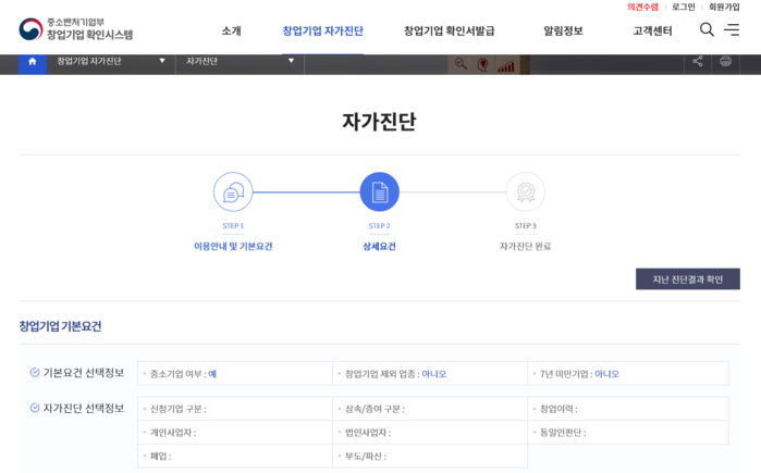 ② 회원가입 전에 자가 진단을 통해 법령에 따른 창업기업에 해당하는지, 자사가 어떤 서류를 제출해야 하는지 등에 대해 사전 정보를 취득할 수 있도록 했다.