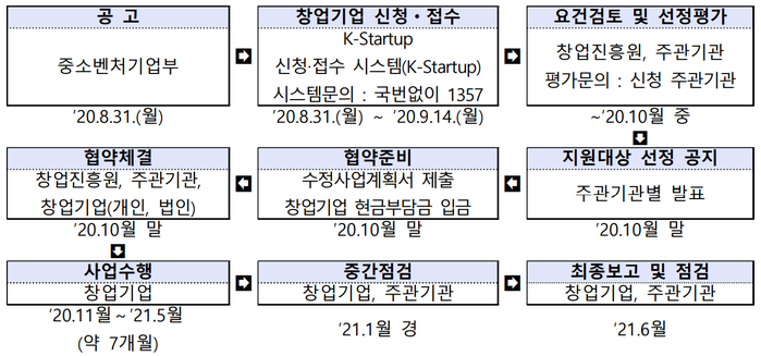 접수는 2020년 8월 31일부터 9월 14일까지 중소기업벤처부 홈페이지에 게재된 공고문의 붙임양식을 사용한 사업계획서와 각종 증빙서류와 아이템 도면 등이며 K-START을 통한 온라인 신청만 가능하다. 선정평가는 1차 서류평가와 2차 발표 평가 그리고 현장 확인 등으로 진행하고 최종선정은 종합적인 점수를 기준으로 고득점자 순으로 선발할 예정이다.