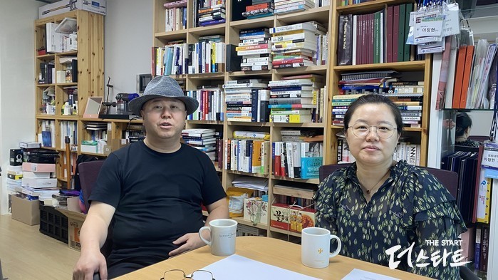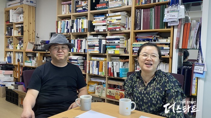 | ▲ 비즈니스 디자인 연구소 '이화주 대표(우)'와 경희대학교 컴퓨터공학 '이정헌 교수(좌)'가 인터뷰에 응하고 있다.d |