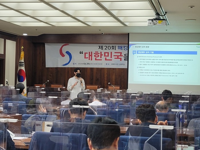 한국해킹보안협회(회장 박성득, 이하 ‘협회’)는 국회 4차산업혁명포럼(대표     이상민·서병수)과 공동으로 6월 29일(수), 오후 2시부터 2시간 동안 “대한민국을     방어하라”는 표제로「제20회 해킹보안세미나」를 사이버 보안 관계자 및 전문가들이     참석한 가운데 국회도서관 소회의실에서 개최됐다고 밝혔다.