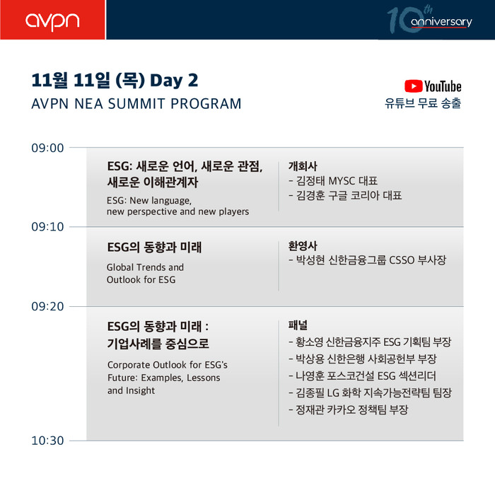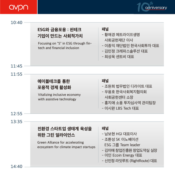 이번 행사는 AVPN 나이나 슈바왈 바트라(Naina Subberwal Batra) 의장 겸 대표가 “동북아시아를 위한 앞으로의 10년” (The Asian Decade for Northeast Asia)을 주제의 모두 발언으로 개회할 예정이다. AVPN은 올해 창립 10주년을 맞이해 ‘더 나은 아시아를 위한 10개년’(The Asian Decade)이라는 비전을 선포한바 있다.