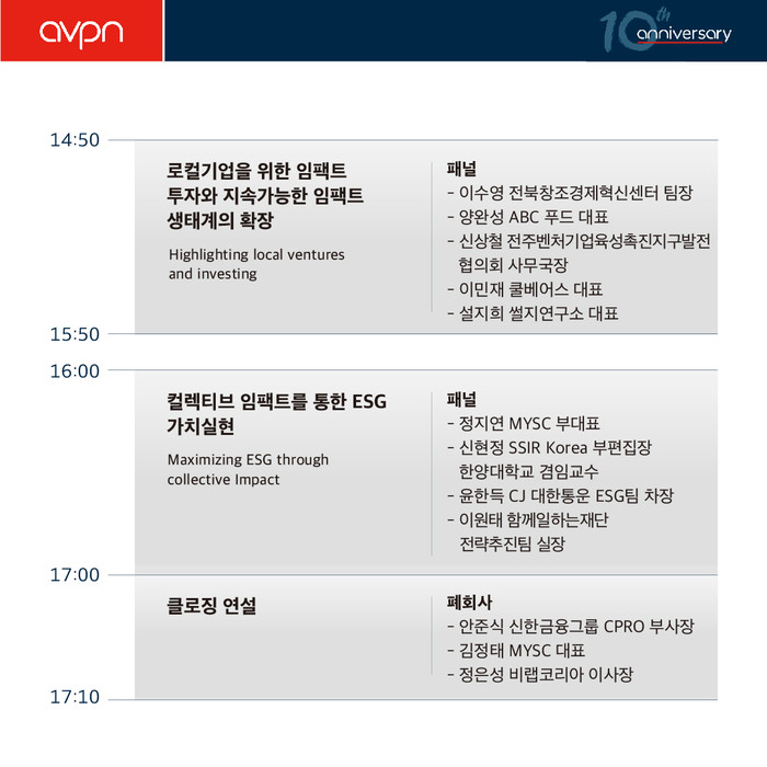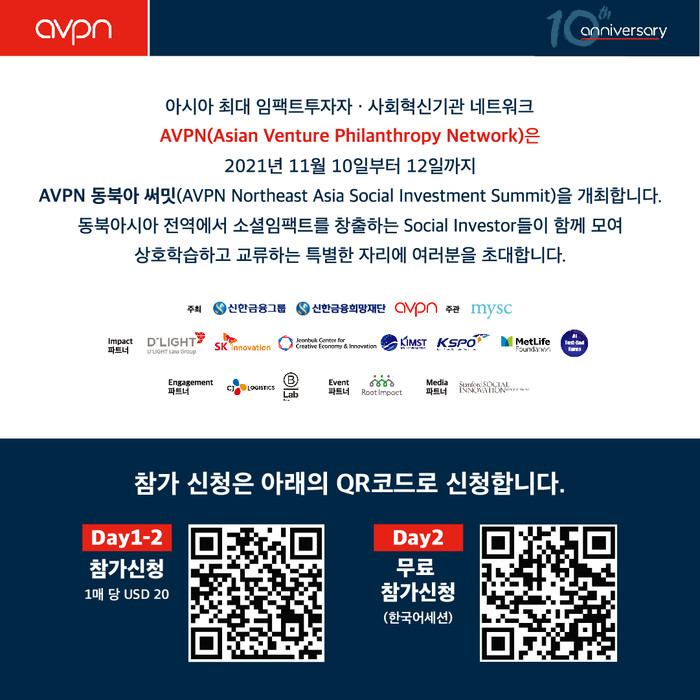 “ESG: 새로운 언어, 새로운 관점, 새로운 이해관계자”라는 주제로 개최되는 이번 행사는, AVPN과 신한금융그룹, 신한금융희망재단이 공동 주최, AVPN 한국대표부와 ㈜엠와이소셜컴퍼니(MYSC)가 주관한다.