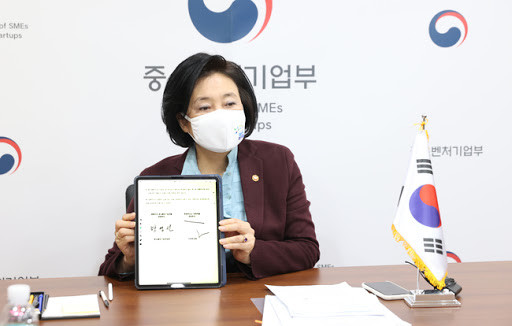 | ▲ 박영선 중소벤처기업부 장관이 온라인으로 양해각서를 체결하고 있다. (사진출처=중기부) |
