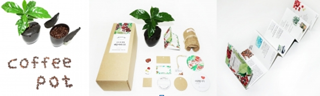커피팟[Coffee pot] 나의 첫 번째 애완 커피나무’는 커피찌꺼기로 만들어진 커피콩 형태의 화분에서 자라나는 커피나무로 가이드북과 이름표, 메시지카드 겸 코스터(글라스 메트)와 분갈이 화분이 들어있다.