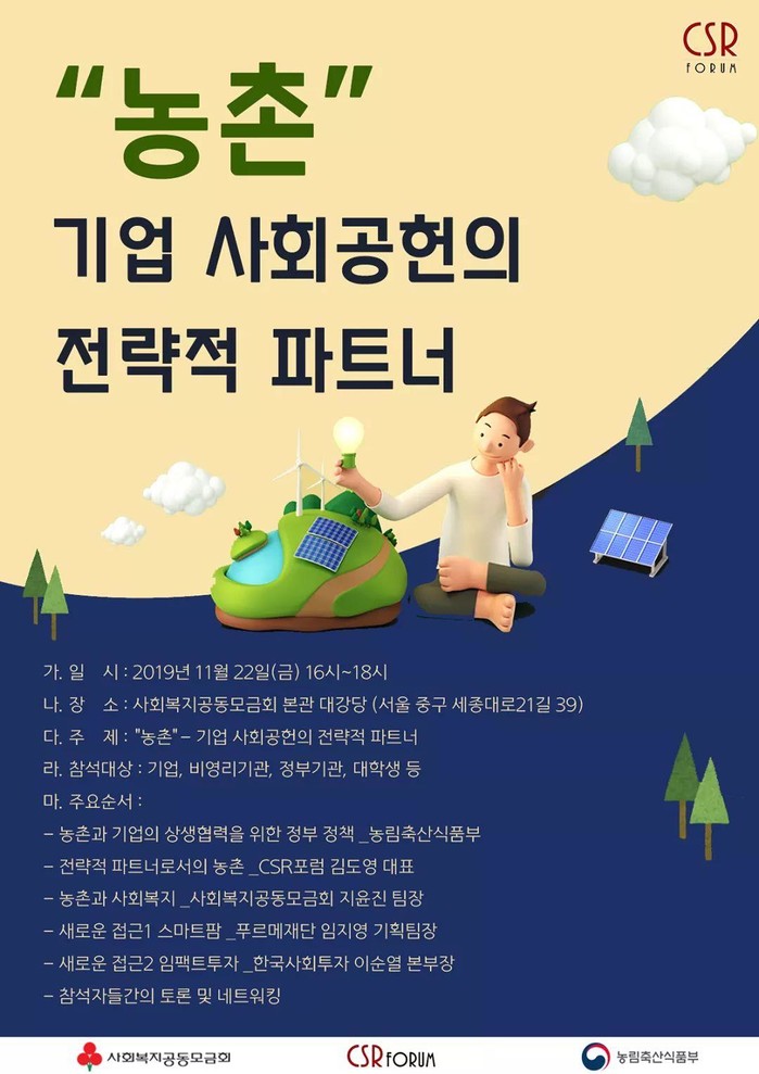 이번 행사는 농림축산식품부와 CSR포럼 그리고 사회복지공동모금회가 공동 주최로 개최하는 포럼으로 사회복지공동모금회 대강당 본관에서 진행된다.