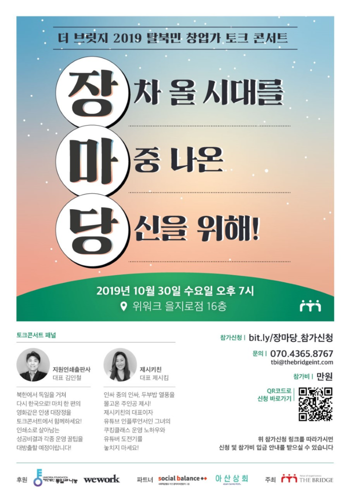 이번 토크 콘서트는 '장차 올 시대를 마중 나온 당신을 위해!(장·마·당)' 라는 주제로 지난 7월 행사에 이어 탈북민 창업가들의 정착 과정과 창업 배경을 나누고, 탈북민 기업 부스를 통해 현재 운영하는 사업체의 여러 상품과 서비스 등을 소개하는 자리로 마련됐다.