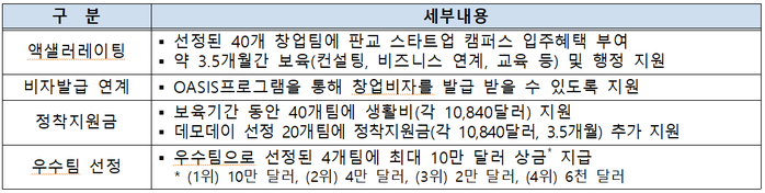 글로벌 스타트업 비즈니스 허브로 육성하기 위해 2016년에 처음 마련한 창업경진대회이다. 또한, 국내정착을 지원하고 창업 비자 교육 과정을 제공하는 등으로 지난 ’16년부터 ’18년까지 3년간 총 162개 해외 스타트업의 국내 유치를 지원했다.