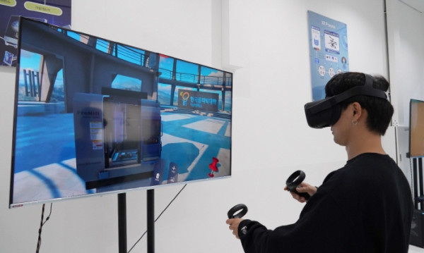 ‘고글형 영상표시장치(HMD)’를 착용하면 ‘러닝팩토리’ 배경의 가상 학습 공간에서 ‘자율 주행 물류 운반차’ 제작 공정을 단계별로 체험할 수 있고, 장비를 직접 만지지 않고도 현실감 있는 경험과 몰입감을 느낄 수 있다는 장점이 있다.